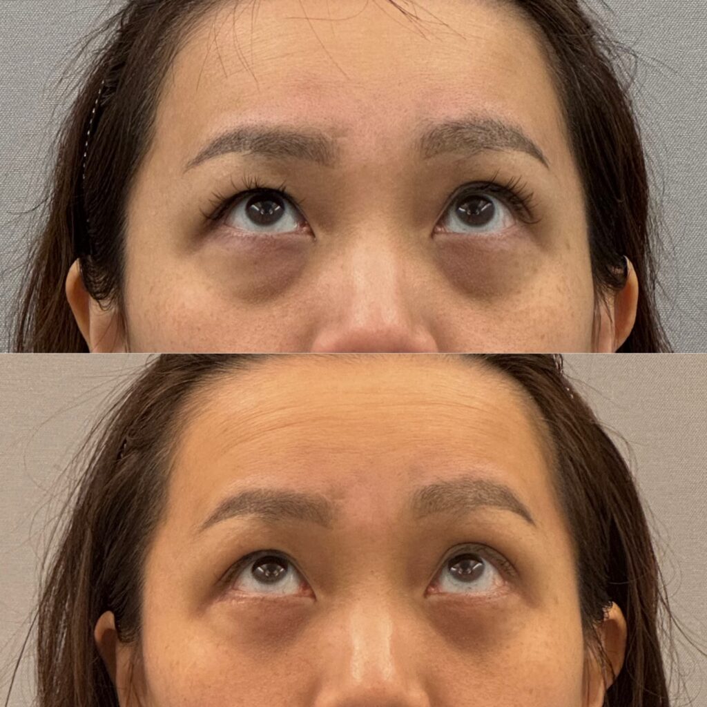 クマのお悩みでした。年齢とともに目の下の脂肪が飛び出してきて影ができることでできるいわゆる黒クマ、影クマが原因でした。一部色素沈着も見られるのでこちらは手術では改善しないため後日別の治療が日強いうになることもあります。ただ気になる突出や溝が良くなると気にならなくなることも多いです。脂肪をとるだけではしわが目立つ可能性があるため表ハムラで行いました。疲れ顔と感じていたのは全く感じないですね。傷は半年後まで赤く目立つ生地がありますが最終的にかなり目立ちにくくなります。