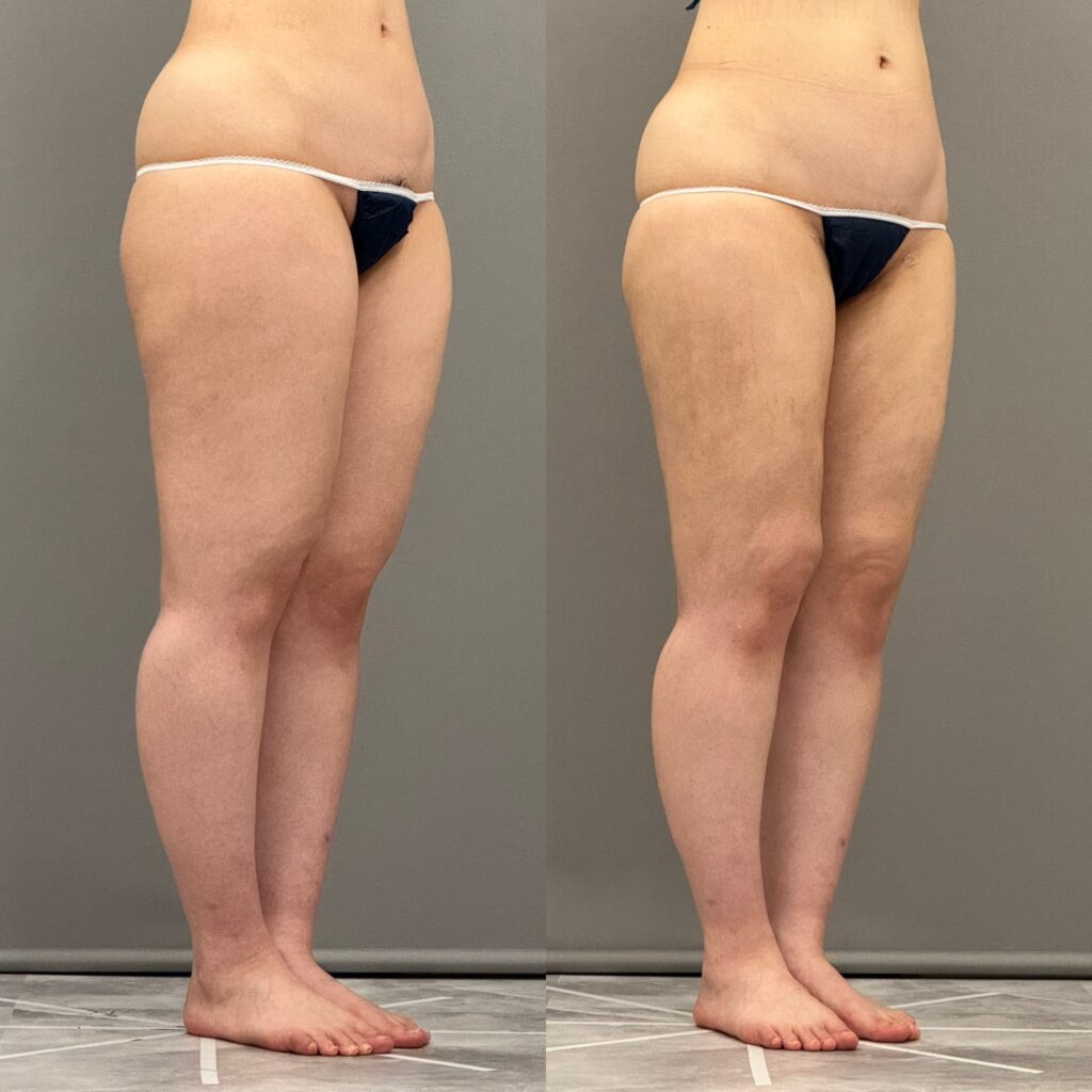 20代女性 171cm 71kg BMI24.3 太ももが全体的に気になるとのことでした。太ももは全周吸引がオススメです。シルエットを整えるだけであれば前面や後面の2部位でも可能ですが、しっかりと細さも追求するならやはり全周吸引ですね。かなりの量が吸引できたので色素沈着や拘縮やむくみが残っていますがすでに細さと変化を実感されています。ここから6ヶ月にかけてさらに引き締まり細くなって、色味もよくなり完成します。仕上がりがとても楽しみですね。料金:VASER脂肪吸引(太もも全周)660,000円(税込) 別途静脈麻酔代や血液検査代や固定着代がかかります。副作用・リスク:出血、感染、色素沈着、傷跡、凹凸を生じる可能性、左右差を生じる可能性、理想とする仕上がりと異なるなど。